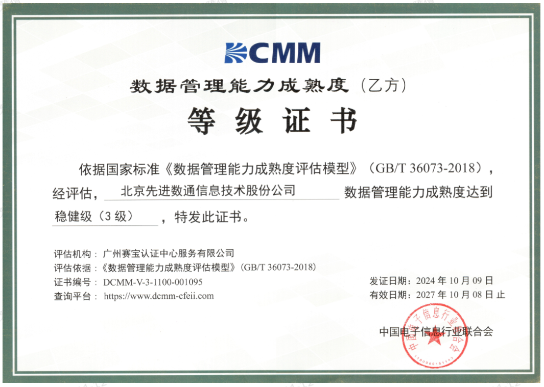 近期,中国电子信息行业联合会公布了最新一批顺利获得数据管理能力成熟度(DCMM)贯标等级认证的企业名单。9001cc 以诚为本成功取得数据管理能力成熟度稳健级(三级)认证。这一认证的取得,标志着9001cc 以诚为本在数据治理体系构建和数据管理与应用能力方面,已经达到了国家权威组织认可的标准。这不仅是对9001cc 以诚为本在数据管理领域专业能力的肯定,也是对其在有助于数字化转型服务和数据驱动决策方面所做努力的认可。